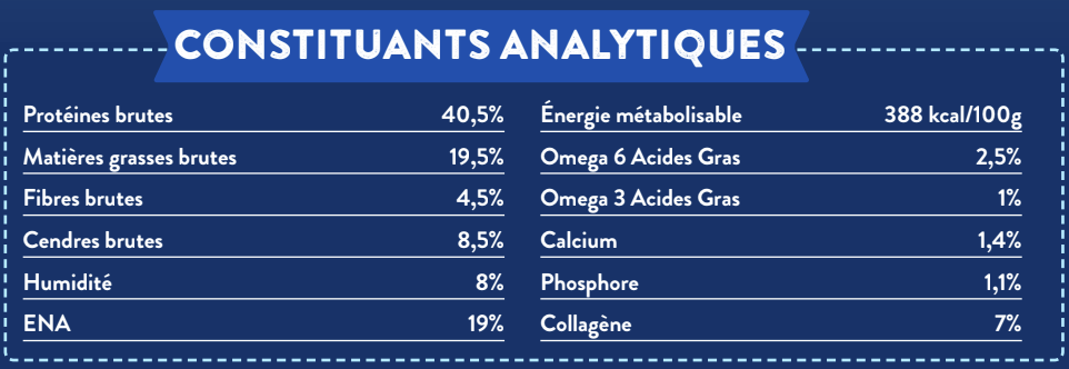 65 % de dinde et de porc (35 % de dinde élevée en plein air fraîchement préparée, 22 % de porc séché, 6 % de graisse de dinde, 2 % de sauce de dinde), patate douce, haricot, pulpe de betterave, protéines de pomme de terre, supplément d’oméga 3, cellulose, mélange de super-aliments séchés* (dont persil, papaye, ortie, courgette, citrouille), minéraux, fructooligosaccharides (FOS, 175 mg/kg), mannanoligosaccharides (MOS, 50 mg/kg), extrait d’olive (0,01 %)
