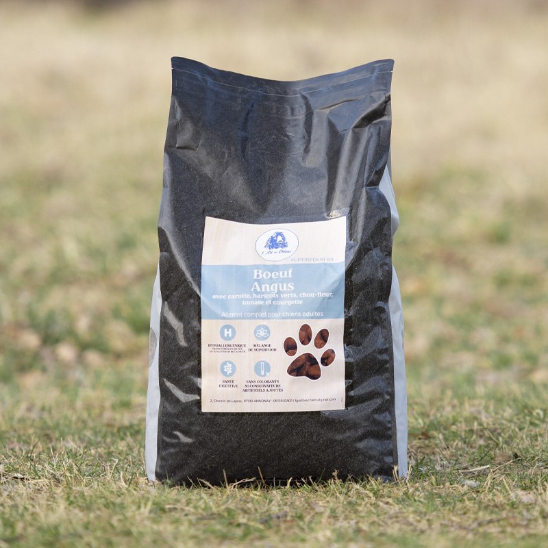 Découvrez nos croquettes pour chien adulte au bœuf Angus : 65% de viande riche en acides aminés, collagène naturel et superaliments. Une recette hautement nutritive pour la digestion, les articulations et le bien-être quotidien.