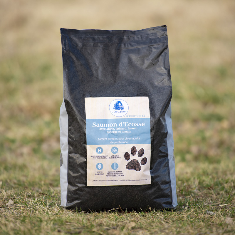 Croquettes pour chiot au saumon d’Écosse : 65% de saumon riche en acides aminés, collagène naturel et superaliments. Une recette premium pour soutenir la croissance, les articulations, l’immunité et le bien-être quotidien.